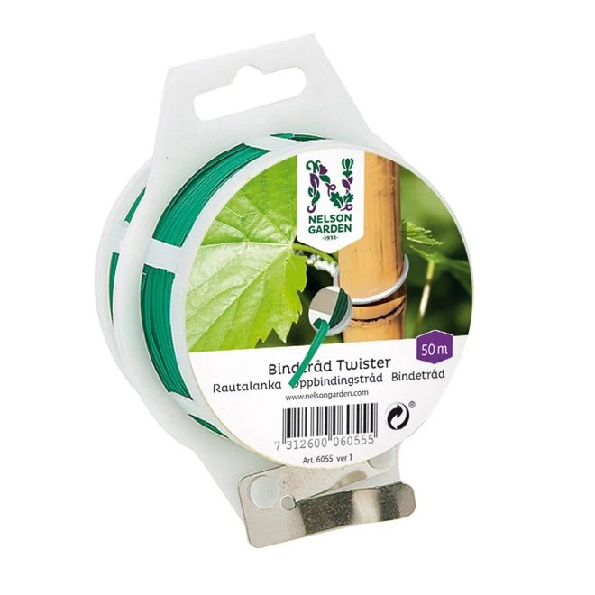 Plastöverdragen metalltråd för mjuk uppbindning. På rulle med avbitare.