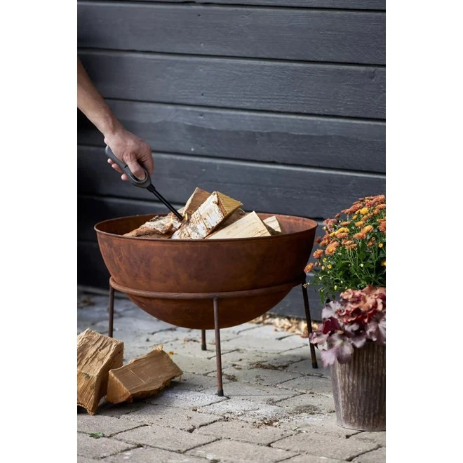 Eldfat i rostig stål på fyrbent stativ