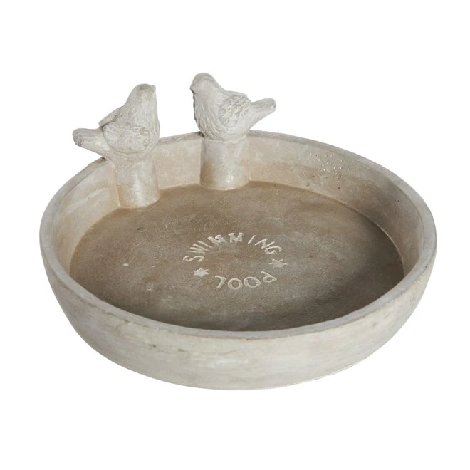Fågelbad i cement med två fåglar sittande på skålkanten. Vitkalkad look. Text i botten på badet, ”swimming pool”.