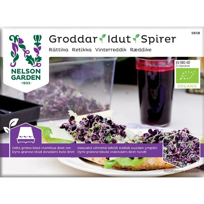 Ger en spännande smak till sallader och kött, och innehåller höga halter av vitaminer och mineraler. Groddarna kan även ställas ljust för att utvecklas till skott.