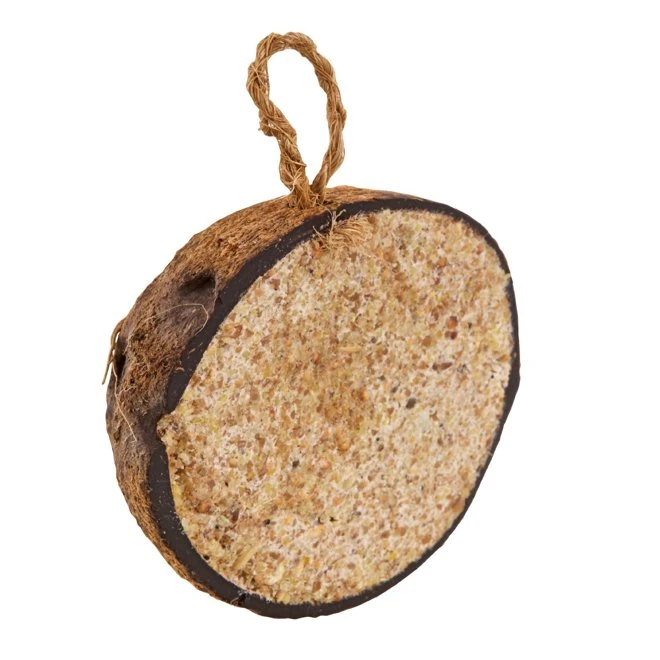 En halv kokosnöt med jutesnöre som är fylld med talg och fröer. Det är bara att hänga upp den till vildfåglarna och se dem flockas runt den goda maten.
