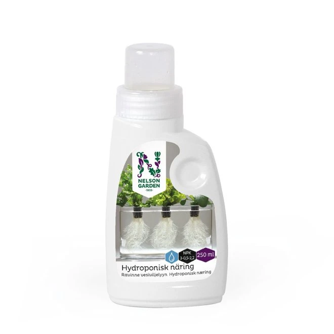 Växtnäring, specialanpassad för hydroponisk odling, d.v.s. odling i vatten. Behändig flaska med praktisk skala i korken, som gör näringen lätt att dosera. Räcker till flera odlingsomgångar. NPK 4-0,7-3