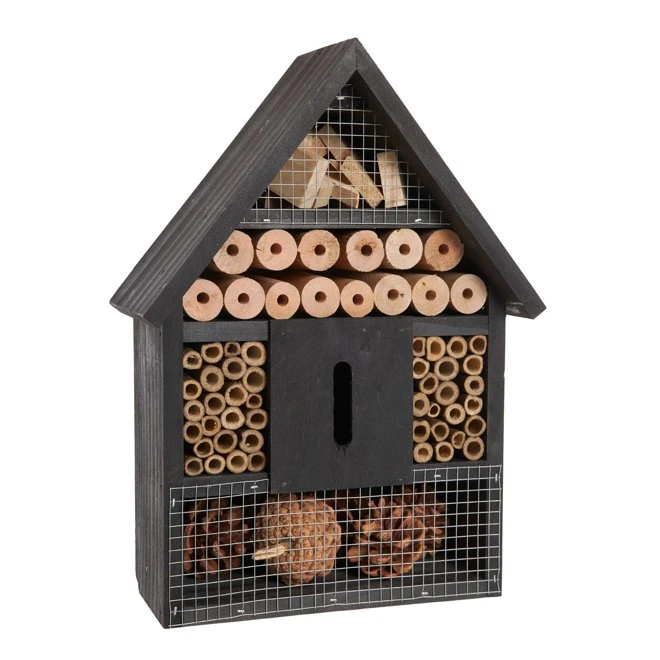Snyggt insektshotell med olika bomaterial. Allt för att locka till sig olika insekter som gör nytta i våra trädgårdar.
