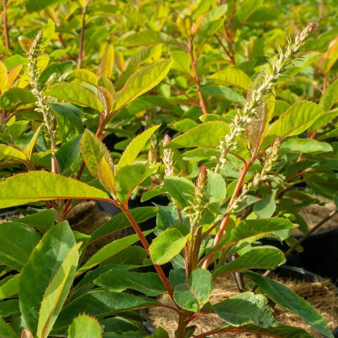 Buske med friskt, grönt bladverk med druvklasliknande, doftande blommor. Trivs bäst i halvskuggiga lägen och planteras i fuktig jord med lågt pH. Passar bra i samplantering med andra surjordsväxter såsom rhododendron. Blommar sent och får v…