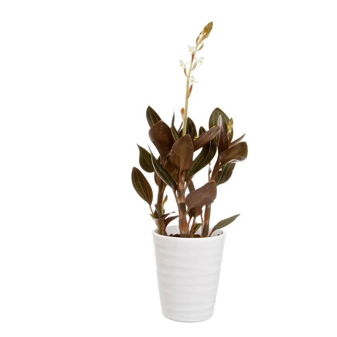 Hos juvelorkidén är det nästa mer bladen som är i fokus än blommorna. De purpurröda bladen har nerver i kontrasterande färg, till exempel rött eller limegrönt. Ådringen går i bladens längdriktning. Blommar med sobra vita blommor som sitter …