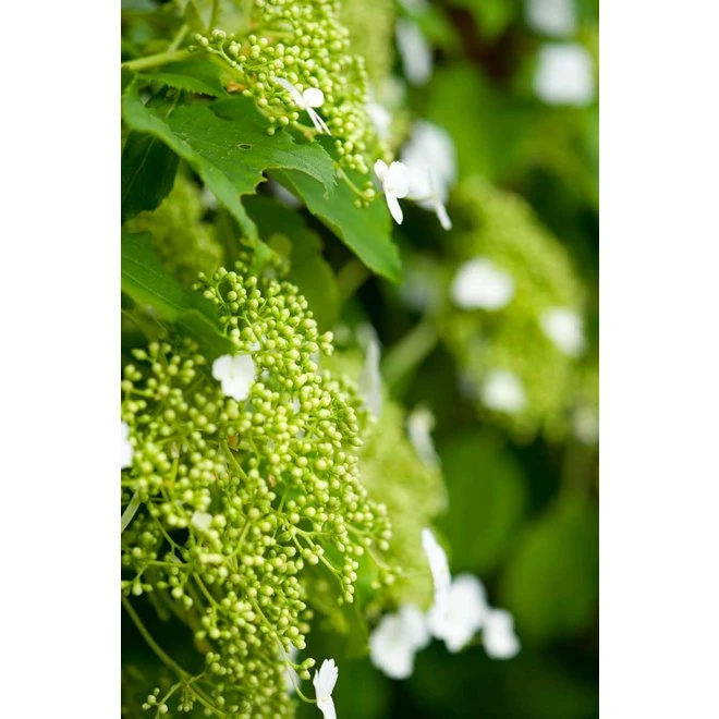 Elegant, klättrande hortensia med frodigt, grönt bladverk som får vacker gyllengul höstfärg. Klättrar och fäster sig med hjälp av självhäftande luftrötter. Blommar rikligt i juni-juli med luftiga, flata, vita blomställningar som består av s…
