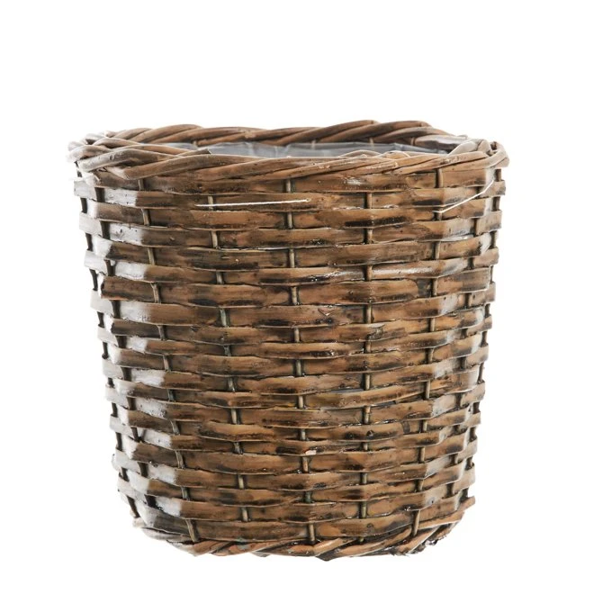 Cylinderformad, flätad korg, med plastklädd insida för att förhindra vattenläckage.