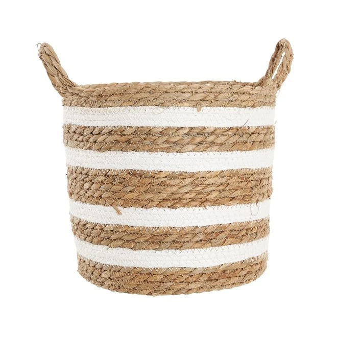 Korgkruka med handtag, tillverkad av sjögräs och jute. Har inflätade vita ränder på tvären. Med plastad insida för att skydda underlaget.