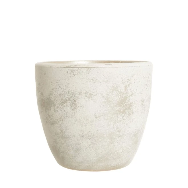 Keramikkruka med något utsvängd form, vidast upptill. Ljusgrå grundfärg med inslag av mörkare grått i melerat mönster som gör varje kruka unik till utseendet.