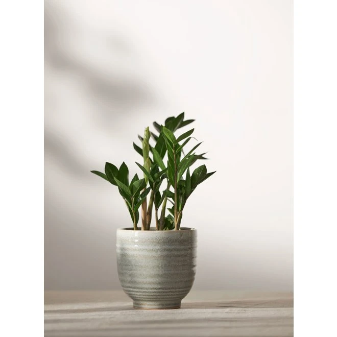 Keramikkruka på fot. Reaktiv glasyr gör varje kruka unik i färgen.
