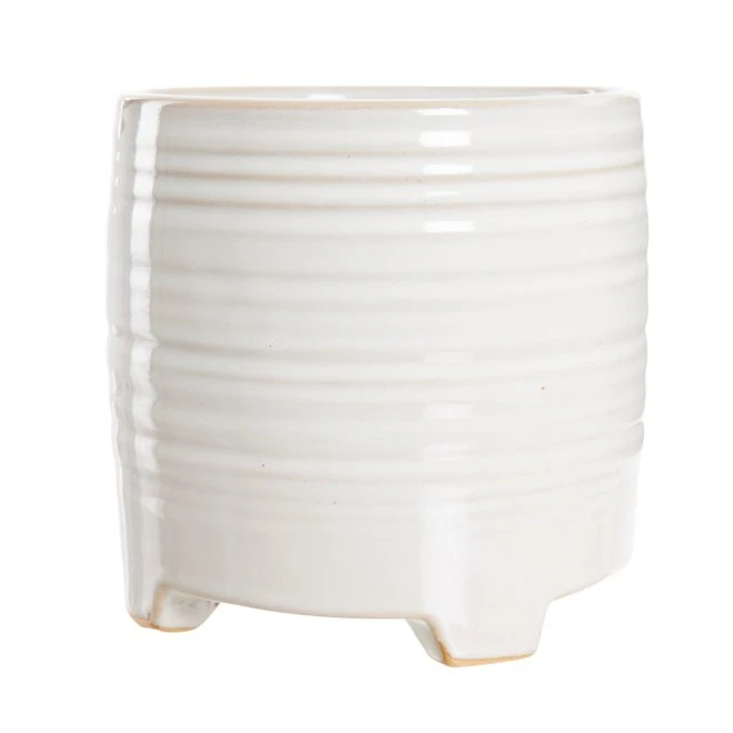 Vitglaserad keramikkruka med vertikala ränder och liten fot.