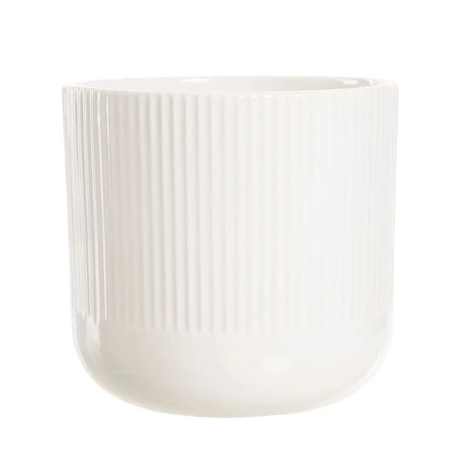 Keramikkruka med vertikalt, veckat mönster som sträcker sig från toppen nästan hela vägen ner till botten på krukan.