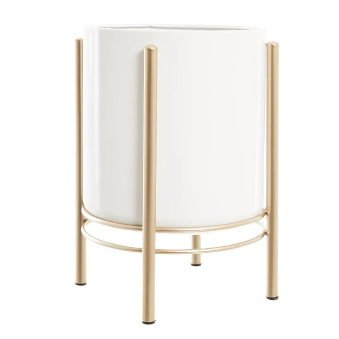 Metallkruka i ställning. Krukan kan tas ur ställningen, och finns i vitt och svart. Matchar även med piedestal Thea som finns i två höjder och både som svart och vit. Sätt ihop alla tre krukorna och gör dina växter till en del av inredninge…