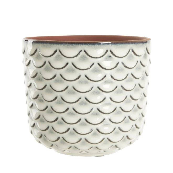 Glasyren är tunnare upptill på fjällen och tjockare nedtill. Detta ger en vacker effekt som verkligen framhäver krukans mönster. Brun kant på fjällen förstärker dess form. Krukan är transparant glasera…