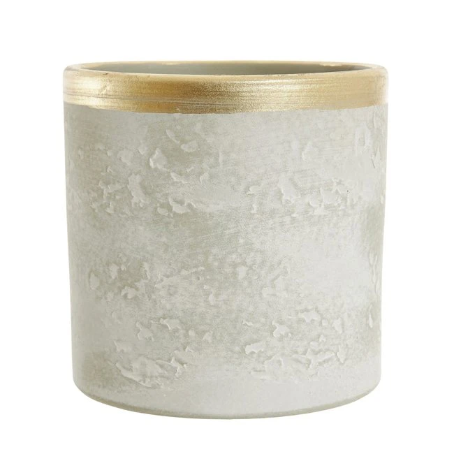 Cylinderformad keramikkruka i patinerad look med målad guldkant i ovankant. Krukan har en ljusgrå grundton med svepande stråk av grått.