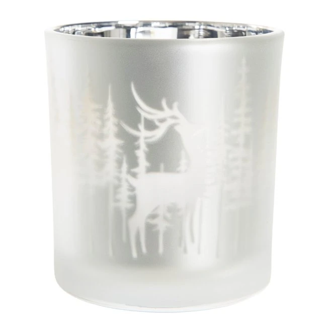Vacker ljuslykta för värmeljus. Utsida av frostat glas och insida blankt och reflekterande. Genom glaset lyser siluetter.