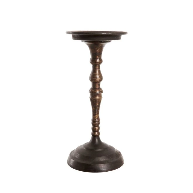 Ljusstaken har lika bred bas som topp. Där ljuset placeras finns en liten, låg kant. Färgen påminner om svärtad mässing.