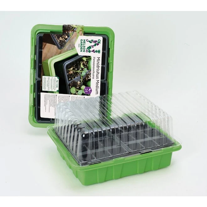 Lättplacerat minidrivhus. Fördjupningarna i växthusets botten passar även till torvbriketter.