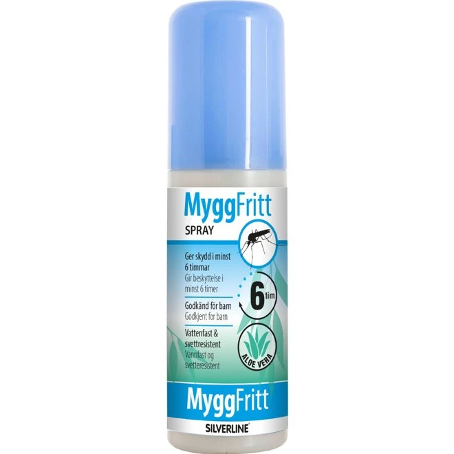 Myggspray från Silverline som är baserad på växtbaserad citroneukalyptusolja. Sprayen appliceras enkelt på huden. Innehåller Aloe Vera som är mjukgörande och verkar läkande på huden.