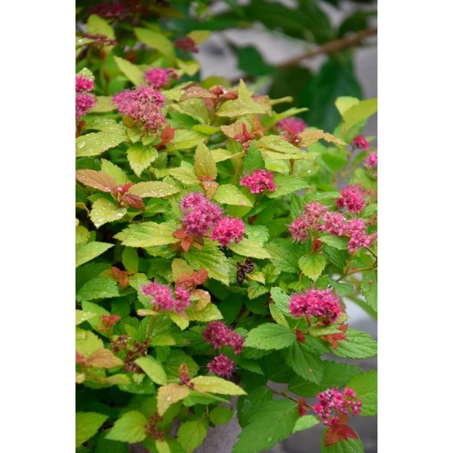 Kompakt spirea med ett lågt, brett växtsätt. Vackert gulgrönt bladverk där nya skott är dekorativt kopparröda. Bladen är ovala, långsmala med lätt tandade bladkanter. Som vackrast är busken i sitt bladutspring då bladverket är lysande koppa…