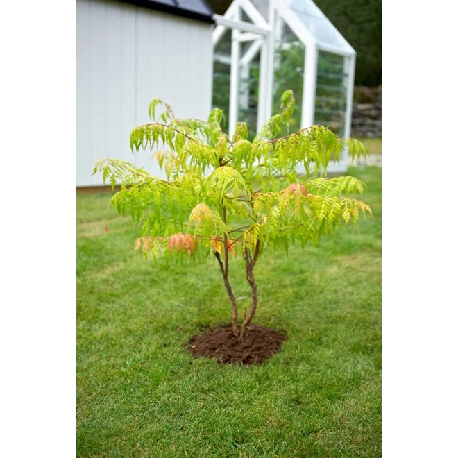 Rönnsumak med gröna blad som tidigt övergår till guldgula. Får väldigt intensiva höstfärger i gult, orange och rött.