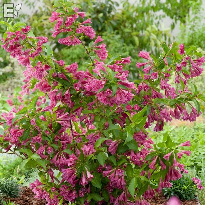 Bred buske med ett kompakt växtsätt. Blommar rikligt med trattformade karminrosa blommor kontinuerligt under sommaren. Bladverket är mörkgrönt och blankt.