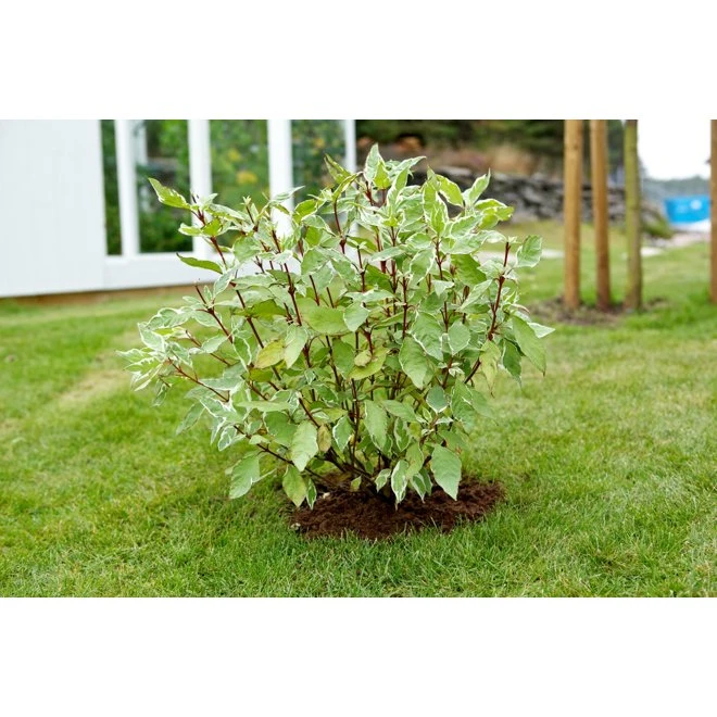 Kompakt variant med ett yvigt och utbrett växtsätt. Vackert grenverk där unga grenar och skott är mörkt vinröda. Bladverket är den största prydnadsmeriten då de ovala, avlånga bladen är vackert ljusgröna med vita, ojämna kanter. Höstfärgern…
