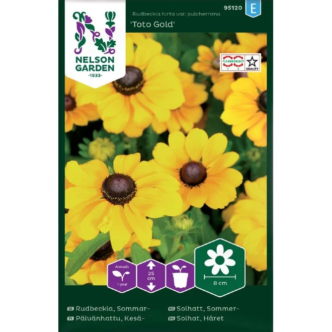 En mycket låg sort av sommarrudbeckia. Kompakt växtsätt och översållad av gyllengula blommor med den typiska mörkbruna mitten. Vacker i rabatt, krukor och balkonglådor. Trivs i näringsrik plantjord. Gödsla och vattna rikligt. Även om planta…