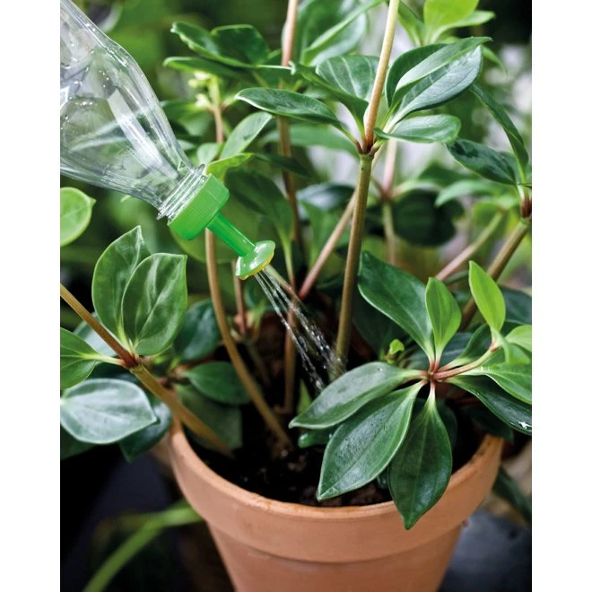 Strilen skruvas på flaskan istället för korken och gör flaskan till en vattenkanna som är smidig att använda när du vattnar dina krukväxter.