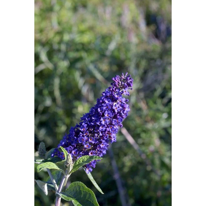 Får rikligt med långa, mörkvioletta blomklasar i toppen på årsskotten. Smala, grågröna, lansettlika blad.