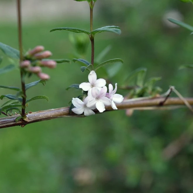 Vacker sort med ett buskigt växtsätt och överhängande grenar. Grågrönt bladverk av små, parställda, avlånga blad som inte får någon nämnvärd höstfärg. Blommar på våren med doftande, rosavita, klockliknande blommor som sitter i bladvecken lä…
