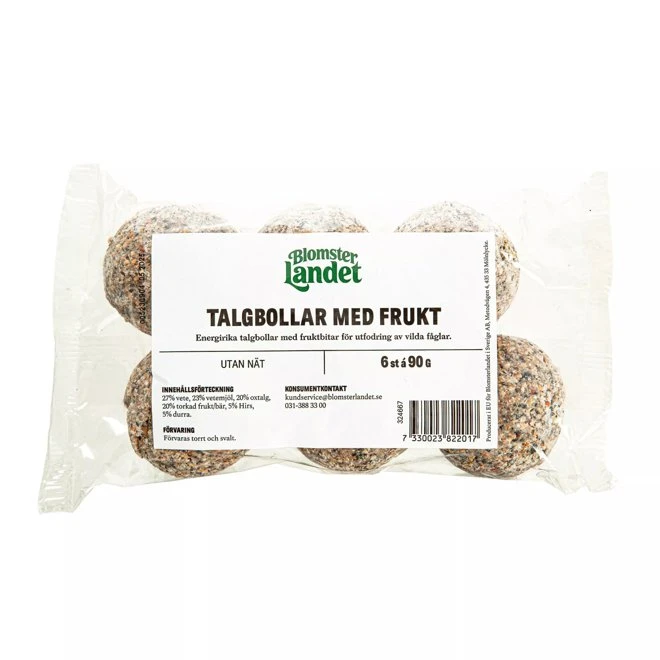 Energirika talgbollar med fruktbitar. För utfodring av vilda fåglar.