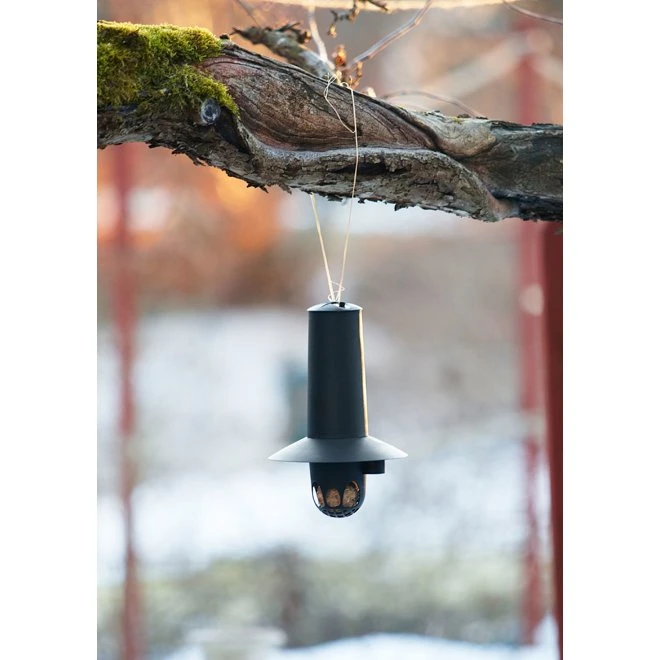 Kan monteras på pinne eller hängas upp i en krok eller ett snöre i ett träd.