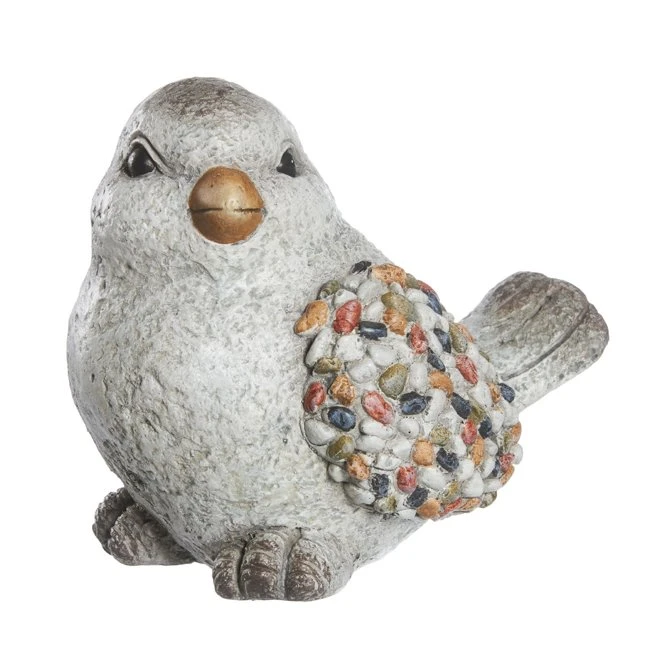 Glasfiberfågel. Dekorerad på ett sätt så att det ser ut som om vingarna är klädda med småsten.