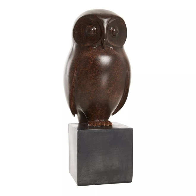 Dekorativ och stilren uggla stående på en fyrkantig bas.