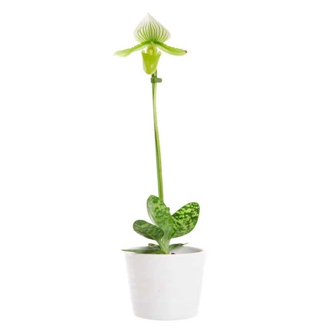 Uppseendeväckande blomma med uppsvälld, rundad grön läpp och spetsigare, grönrandiga kronblad.