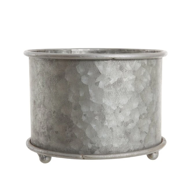 Cylinderformad zinkkruka på fötter. Krukan har en rundad kant både upptill och nertill. Ytan kan uppfattas som hamrad då den har ett gråmelerat utseende.